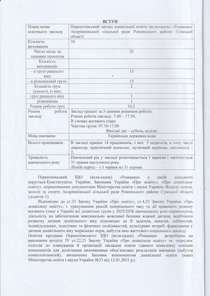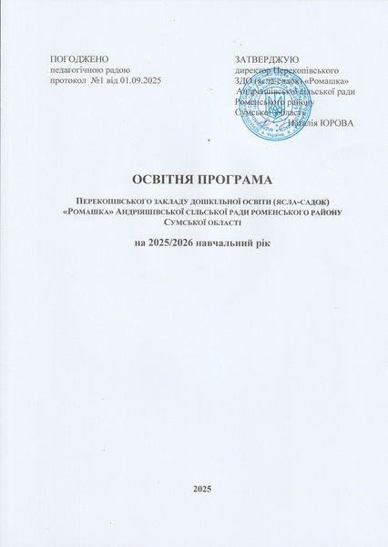 ОСВІТНЯ ПРОГРАМА ПЕРЕКОПІВСЬКОГО ЗДО (ЯСЕЛ-САДКА) "РОМАШКА" АНДРІЯШІВСЬКОЇ СІЛЬСЬКОЇ РАДИ РОМЕНСЬКОГО РАЙОНУ СУМСЬКОЇ ОБЛАСТІ на 2025/2026 навчальний рік