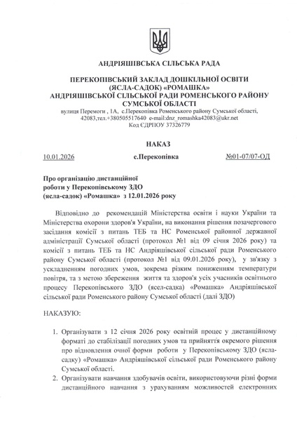 На підставі рішення педагогічної ради Перекопівського ЗДО (ясла-садок) "Ромашка",батьківських зборів онлайн та з метою якісного впровадження дистанційної форми навчання, убезпечення всіх учасників освітньо-виховного процесу було ухвалено рішення про проведення занять у форматі онлайн-навчання за допомогою платформи Google Meet у другу половину дня, а саме з 14.00 години з перервою між заняттями 10 хвилин, та основними формами онлайн- комунікації : батьківських чатів у додатку VIBER та для кожної вікової групи теж створено чати для продуктивного взаємозв'язку.