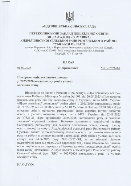 1. ЗАБЕЗПЕЧИТИ РЕАЛІЗАЦІЮ ПОЛОЖЕНЬ НОВОГО ЗАКОНУ УКРАЇНИ "ПРО ДОШКІЛЬНУ ОСВІТУ" У ПЕДАГОГІЧНІЙ ДІЯЛЬНОСТІ ПРАЦІВНИКІВ ПЕРЕКОПІВСЬКОГО ЗДО (ЯСЛА-САДОК) "РОМАШКА" ШЛЯХОМ ОНОВЛЕННЯ ЗМІСТУ ОСВІТНЬОГО ПРОЦЕСУ, ПІДТРИМКИИ АВТОНОМІЇ ПЕДАГОГІВ І ЗАКЛАДУ, УТВЕРДЖЕННЯ ДИТИНОЦЕНТРИЗМУ, ПЕДАГОГІЧНОЇ СВОБОДИ ТА ПАРТНЕРСЬКОЇ ВЗАЄМОДІЇ З РОДИНАМИ, ЗОКРЕМА В УМОВАХ ВОЄННОГО СТАНУ.
