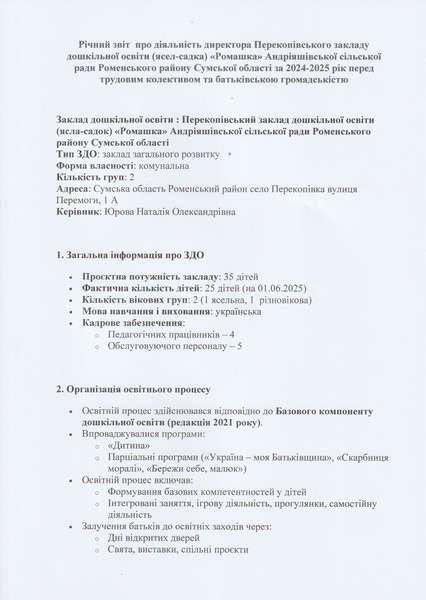 Шановні батьки, колеги та представники громадськості! Відповідно до ст. 30 Закону України «Про освіту» та з метою забезпечення прозорості та інформаційної відкритості діяльності нашого закладу, публікуємо річний звіт директора Перекопівського ЗДО (ясел-садка) "Ромашка" Андріяшівської сільської ради Роменського району Сумської області за 2024–2025 навчальний рік, який охоплює ключові аспекти освітнього процесу, виховної роботи, безпеки, кадрового забезпечення, фінансової діяльності. Запрошуємо ознайомитися зі звітом!
